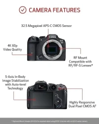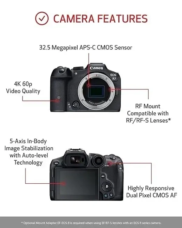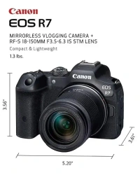- Embark on a visual safari with the Canon EOS R7, paired with the versatile RF-S18-150mm lens. With 32.5MP and 4K at 120p, it captures wildlife's raw beauty and the intimacy of close-ups. In sleek black, it's your passport to explore nature's wonders and uncover intricate details.
