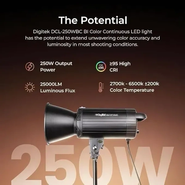 - 𝗣𝗼𝘄𝗲𝗿𝗳𝘂𝗹 𝟮𝟱𝟬𝗪 𝗟𝗘𝗗 𝗟𝗶𝗴𝗵𝘁𝗶𝗻𝗴: Illuminate your space with the Digitek Lite DCL-250 WBC Combo, providing exceptional brightness for photography or videography needs.