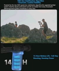 【10th-Gen Stabilization Algorithm】Powered by the new 2025 quaternion stabilization algorithm,the upgraded gimbal system instantly adjusts posture and cancels out shakes from every movement-delivering cinema-grade smoothness in every shot.