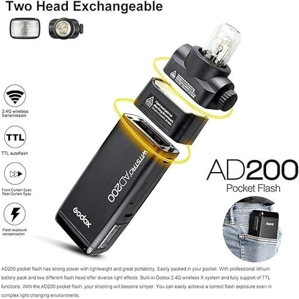 - With the AD200 pocket flash your shooting will become simpler. You can easily achieve a correct flash exposure even in complex light-changing environments.