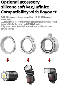 - 💡Comes with Godox mount adapter, round head adapter, and rectangle to round head adapter, widely compatible with most video lights and flashes.