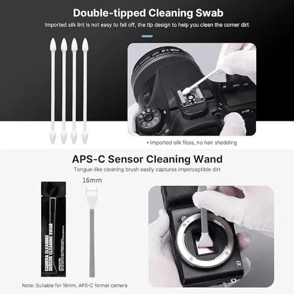 - 【APS-C Sensor Cleaning Wand & Double-tipped Cleaning Swab】 Cleaning tongue with fine texture, easily capture the imperceptible dust, particles (Note: for 16mm, APS-C format cameras). Cleaning swabs are made of imported silk wool and double-tipped design, which will not lose lint and easily solve the trouble of difficult to clean crevices. Great for cleaning contacts, rings, crevices, corners and other parts