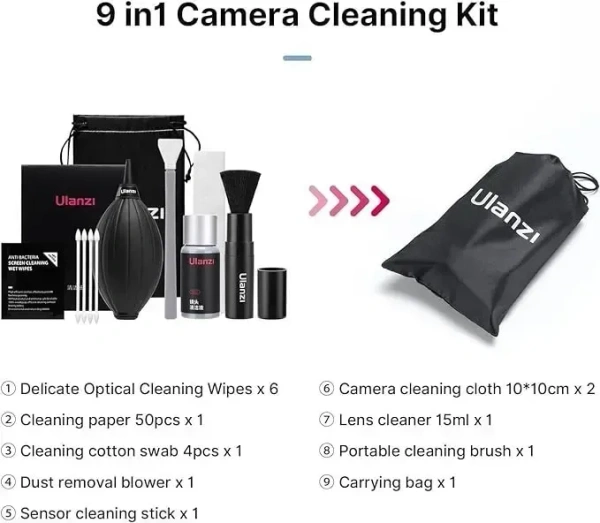 - 【9 in 1 Optical Cleaning Kit】 ULANZI camera cleaning kit contains 9 cleaning items, the total number of up to 67 pieces. More complete than other ordinary cleaning kits, completely sufficient for use. Is a must-have single for photography enthusiasts!