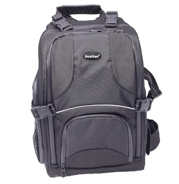 The company's professional quality and backpack Jealiot One DSLR camera, four to five lenses, and a flash A chamber with extra padding Sturdy water-resistant fabric with protective zippers Cells with bottle sides The typical tripod on both sides Laptop or tablet storage on the back Including a raincoat