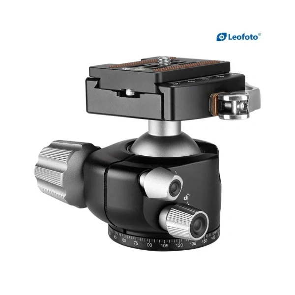The compact yet robust LH-36LR Ball Head with LR-50 Lever-Release Clamp from Leofoto provides an Arca-type quick release system and quick release lever for fast horizon leveling. This flat-base, low-profile head supports loads up to 39.7 lb and features a single ball lock, a tension knob, and a separate pan lock. It also incorporates a bubble level and laser-engraved scales for precise leveling and positioning.