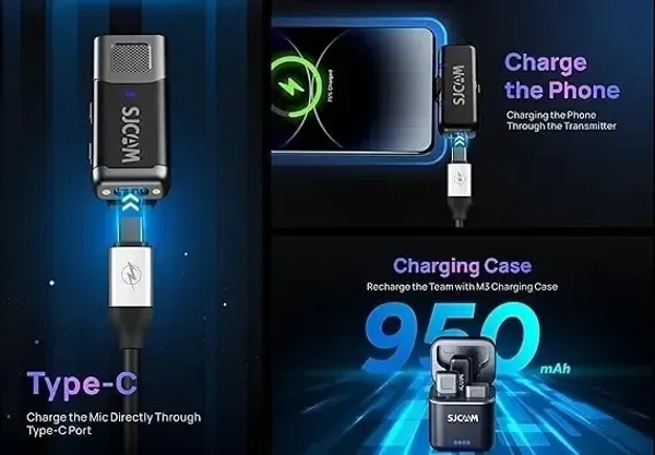 - 𝐒𝐉𝐂𝐀𝐌 𝐌𝟑 : SJCAM M3 Wireless Lavalier Microphone system (2TX+1RX) | 2.4GHz WiFi with Charging case for added portability.